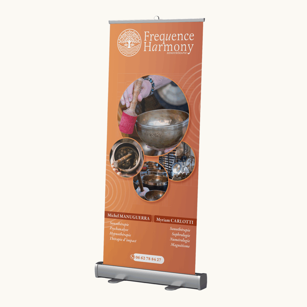J’ai conçu pour Frequence Harmony un logo et un roll-up évoquant la sérénité, les ondes sonores bienfaisantes et l’équilibre naturel.